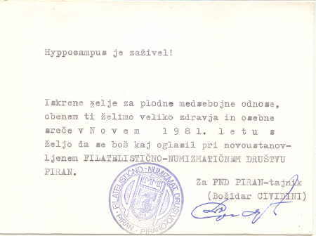 Odločitev da postane lik morskega konjička društveni simbol je bila enostavna. Ob ustanovitvi društva leta 1980 je – naš sedaj žal že pokojni častni predsednik – Božidar Cividini, z ilustracijo morskega konjička veselo oznanil kolegom novico o ustanovitvi Filatelistično numizmatičnega društva Piran.