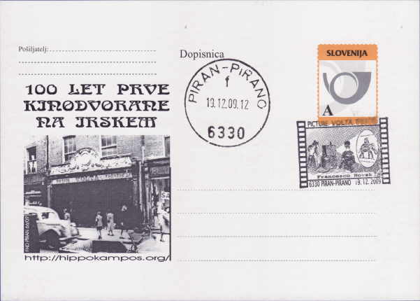 Poleg priložnostnega žiga smo pripravili tudi dotisk dopisnice z motivom pročelja prve kinodvorane na Irskem. Motiv je objavljen z dovoljenjem Irskega filmskega arhiva pri Irskem filmskem inštitutu. Courtesy of Irish Film Archive of the Irish Film Institute. Soglasje za dotisk je Pošta Slovenije izdala 2010 pod številko.